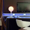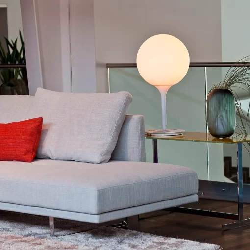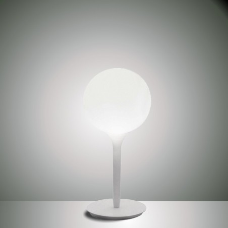 Il design del diffusore sferico viene esaltato dalla presenza di uno stelo luminoso, dalla linea morbida e affusolata, che costituisce il dolce passaggio dalla luce intensa del diffusore alla zona d’ombra della struttura della lampada. Base in zama; stelo in resina termoplastica; diffusore in vetro soffiato.