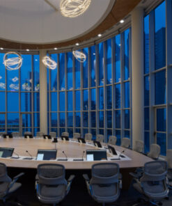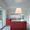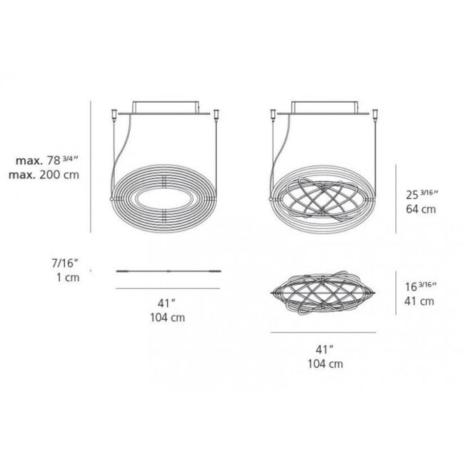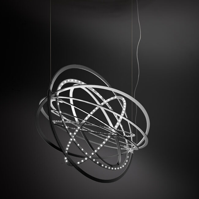 Lampada a sospensione, coordinata col modello da parete. Nove ellissi concentriche e mobili ricavate da una unica lastra di alluminio supportano un circuito di 384 Led bianchi; le ellissi ruotano indipendentemente su due diversi assi, permettendo di orientare lâemissione luminosa e contemporaneamente di ottenere numerose configurazioni spaziali. Quando è chiuso lâapparecchio si presenta completamente piatto.