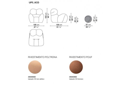 Poltrona dal design unico – disegnata nel 1969 e dalla forma espressiva rivestita in tessuto elasticizzato. Una proposta innovativa a cavallo tra design e arte, frutto del grande know-how tecnologico di B&B Italia nella lavorazione del poliuretano a iniezione. Tra le poltrone spicca l’iconica UP5_6 dagli inequivocabili riferimenti antropomorfi: si tratta infatti di un ampio grembo materno che ricorda le statue votive delle preistoriche dee della fertilità. Con un elemento in più, una sfera che funge da pouf legata al corpo della poltrona. All’immagine della comodità e del comfort, si sovrappone quella più figurata della donna con la palla al piede.