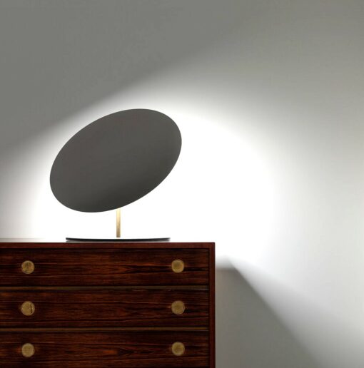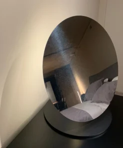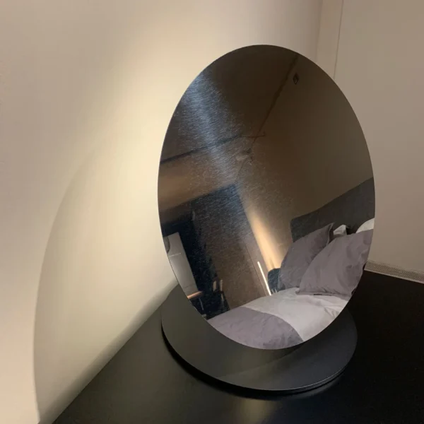 Uno specchio circolare può essere orientato per illuminare e nello stesso tempo cogliere lo spazio circostante. Un lavoro sui piani e sulla bidimensionalità.