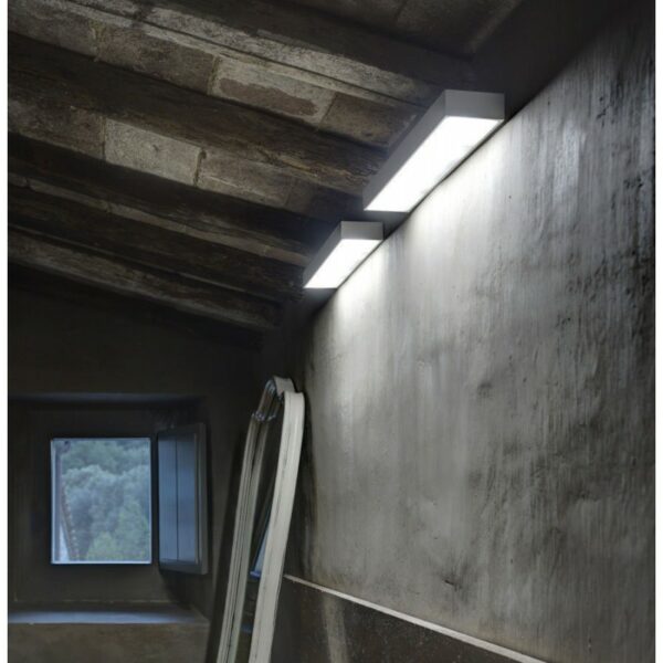 Lampada a parete in metallo e metacrilato disponibile in bianco e nero opaco; una piccola linea di luce: 14 millimetri di spessore per contenere il circuito elettronico e il diffusore.