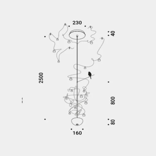Lampada a sospensione con alimentatore da soffitto. Un progetto disobbediente, che traduce in luce una certa ribellione ai modelli comuni di fare lampade. Un lampadario a gocce un equilibrio tra leggerezza e ironia. Ottanta gocce in cristallo e un uccellino. Rami in ottone naturale. Lampada a sospensione dimmerabile a doppia emissione.