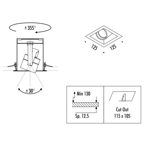 Dimensioni: Spazio minimo per incasso 130mm – Dimensioni taglio cartongesso 115x105mm
