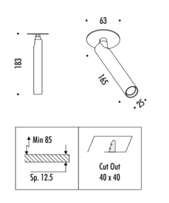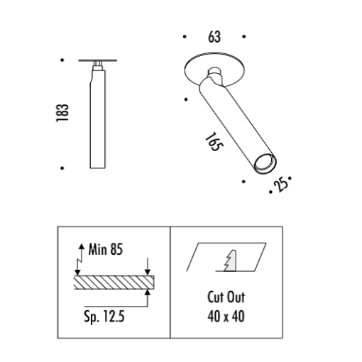 Dimensioni: foro del cartongesso 40×40 mm, spazio minimo per incasso: 85 mm