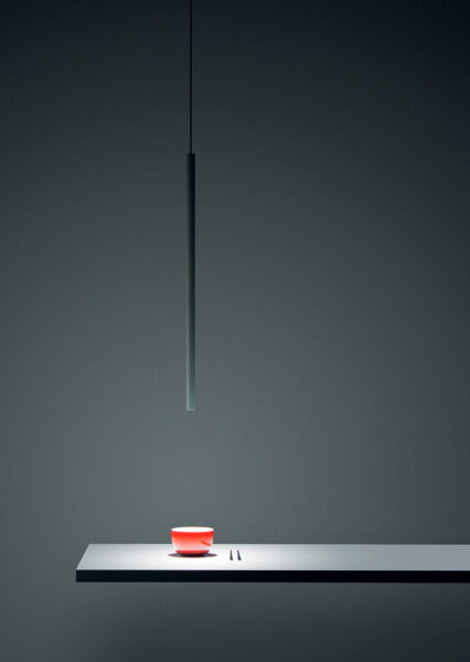 Lampada a sospensione elegante ed esile, l’essenzialità è la componente fondamentale. Un piccolo tubo in metallo per fare una meravigliosa luce sul tavolo. Un vero progetto duale: segno e luce. Disponibile anche nella versione ENDLESS.