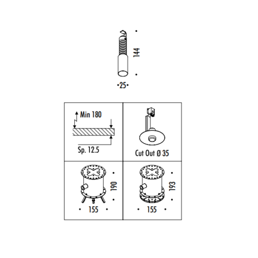 Lampada da incasso, che genera luce e diffonde mistero. È una lampada generosa, che si nasconde al solo scopo di regalare la scena al soggetto illuminato. Ciò che appare è solo un minuscolo buco nero, quasi disegnato. Un foro nel soffitto, un LED potentissimo e una lente che generano la luce.