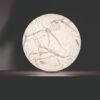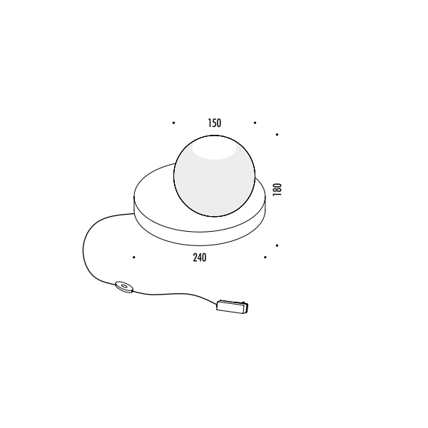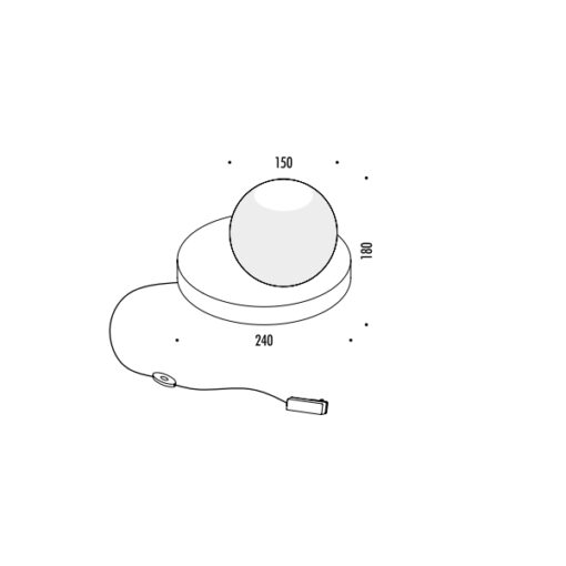 Sfera in vetro sabbiato, base in legno di rovere, dimmer lungo il cavo e cavo nero.
