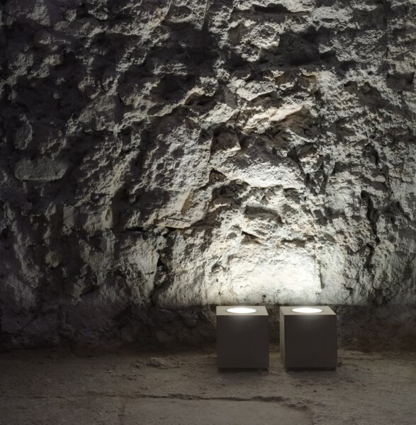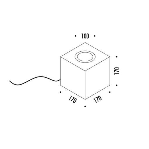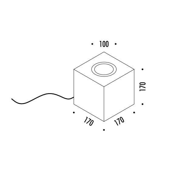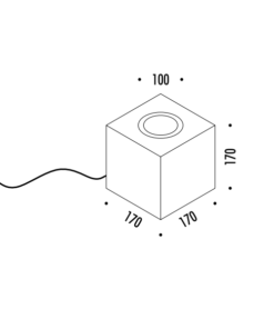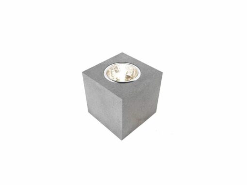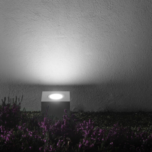 Lampada da terra per esterni in cemento e metallo, a forma di cubo, che permette di interpretare i volumi e le architetture in modo inconsueto e talvolta inedito.