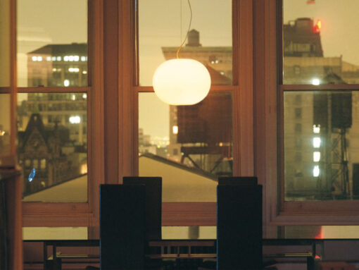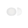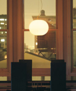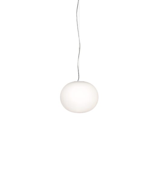 Lampada a sospensione a luce diffusa. Diffusore in vetro opalino incamiciato, soffiato a bocca, con finitura esterna acidata. Supporto diffusore in acciaio stampato verniciato di colore bianco lucido a liquido. Rosone in poliammide caricata con il 30% di fibra di vetro, stampato ad iniezione ed attacco a plafone di acciaio stampato e zincato. Cavo di sospensione di acciaio.