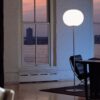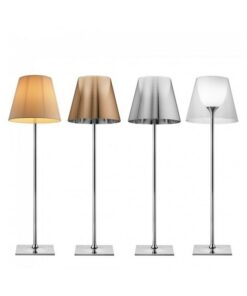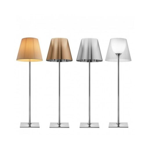 Lampada da terra, a luce diffusa, un pulsante posto in prossimità del diffusore consente, tramite un dimmer “remoto” posizionato sul cavo elettrico in prossimità della spina e la regolazione dell’intensità luminosa su quattro livelli. Base e supporto asta in lega di Zama pressofusa lucidata e cromata.
