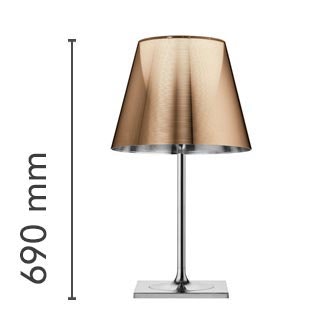 Apparecchio da tavolo a luce diffusa. Base, supporto asta e supporto diffusore in lega di zama pressofusa, lucidata e cromata. Anello superiore in PC (policarbonato) stampato ad iniezione, diffusore completamente trasparente o trasparente e diffusore argento) o marrone trasparente per il diffusore esterno in bronzo.