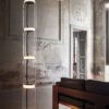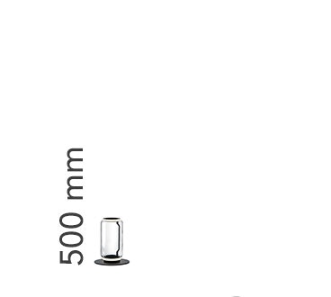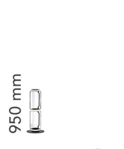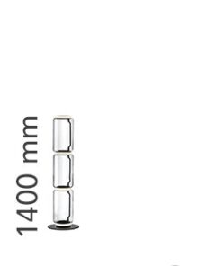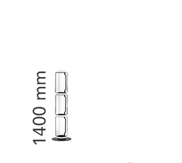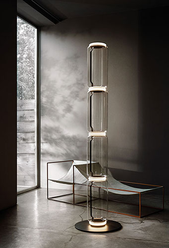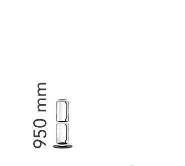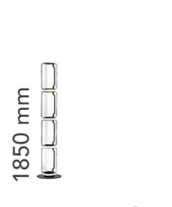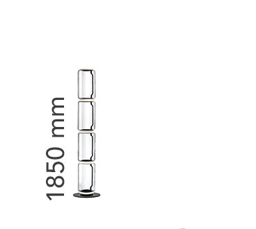 Lampade da terra costituite da moduli in vetro interconnessi che raggiungono un’altezza di 2,17 metri (85,43 “). Struttura cilindrica e semisferica in vetro soffiato trasparente, base e anelli in alluminio pressofuso, bracci laterali interni in acciaio idroformato e anello esterno in silicone opale stampato ad iniezione diffusori