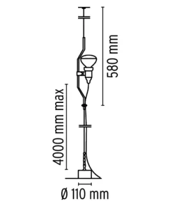 Il corpo illuminante, dove alloggiare la lampadina, può essere spostato in alto e in basso, grazie allo scorrimento del tubolare sagomato in acciaio lungo il cavetto di sostegno in acciaio, sospeso e teso tra il rosone fissato a soffitto e la base appoggiata a terra. La testa della lampada Flos Parentesi, in materiale sintetico nero, permette di orientare la lampadina in ogni direzione ed alloggia l’interruttore, tramite il quale accendere e spegnere la luce.