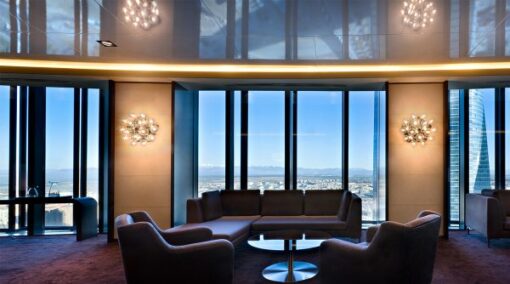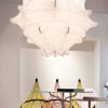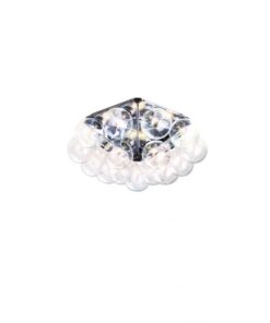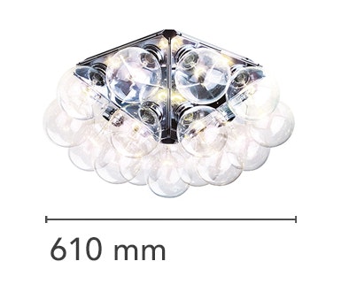 Lampada da parete / soffitto a luce diretta e riflessa. Struttura formata da 5 triangoli in alluminio lucidato stampato. 15 lampade Globolux trasparenti alloggiate intorno alla struttura. Apparecchio a parete / soffitto in acciaio e rosone.