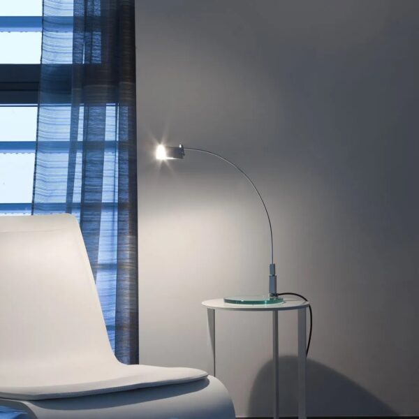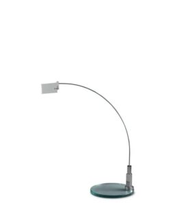 Lampada da tavolo, elegante e leggera, disegnata da Alvaro Siza, questa famiglia di lampade, disponibili nella versione da terra, tavolo e parete. Corpo e alette diffusori orientabili per una gestione totale della luce. Lampada da tavolo a luce direzionabile a doppia intensità non dimmerabile, montatura in metallo cromato con base in vetro flot molato con corpo orientabile a 360°. Alette diffusori, orientabili, in alluminio anodizzato, schermo di protezione lampadina in vetro sabbiato. Il collegamento elettrico fra lo stelo e il corpo avviene tramite jack, cavo di alimentazione, dimmer e spina neri,aAlimentatore su spina europea a due poli. Fonte luminosa non inclusa.