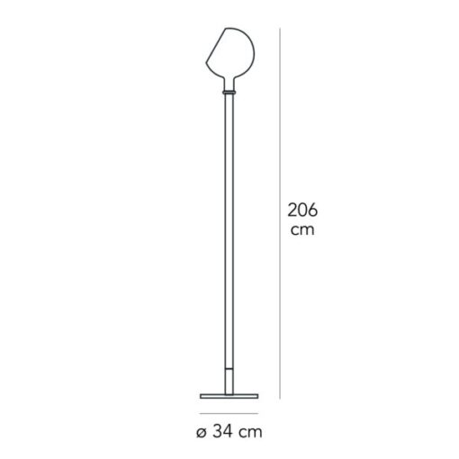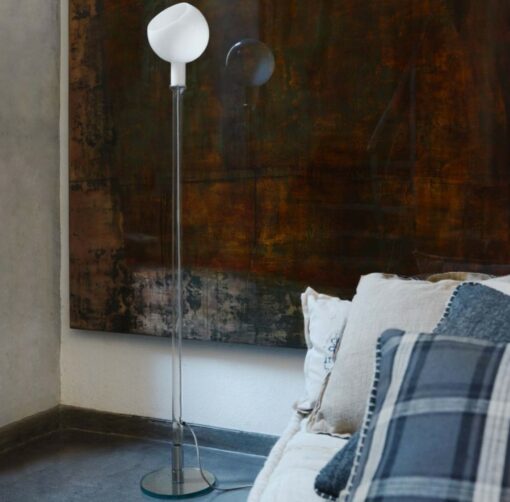 Lampada da terra, disegnata da Gae Aulenti e Piero Castiglioni nel 1980, convivono in un solo oggetto tre diverse tipolegie e lavorazioni del vetro: soffiato, naturale e cristallo naturale. Rappresenta un modello esemplare di integrazione tecnica fra artigianato e industria.