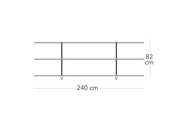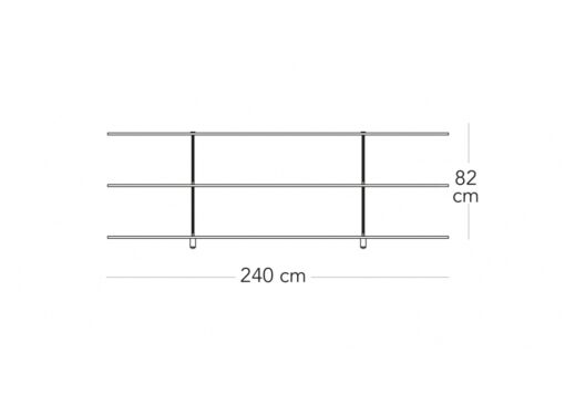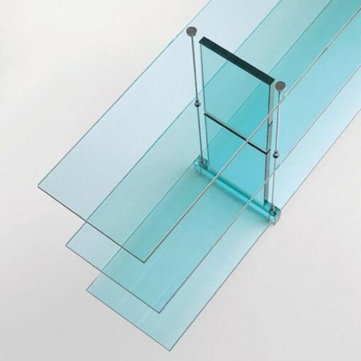 Consolle aperta sui due lati. Ripiani e montanti in vetro float. Tiranti in metallo cromato.