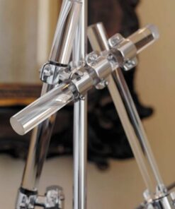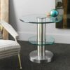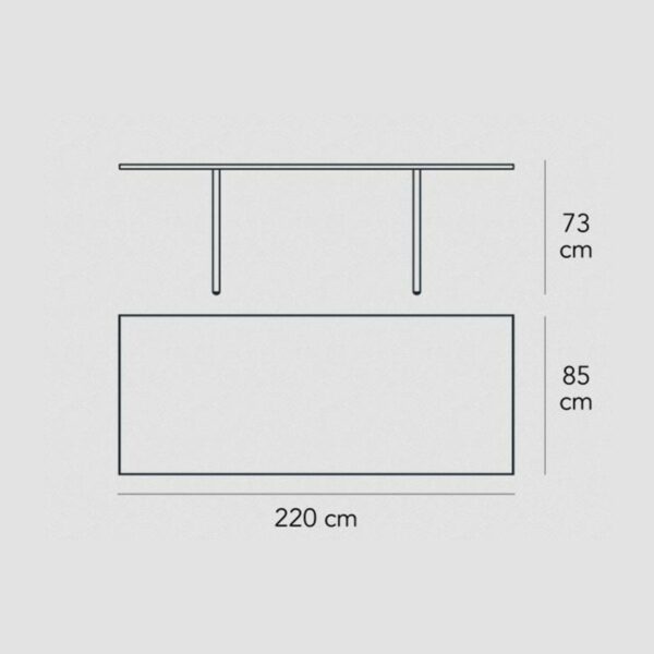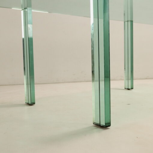 Tavolo con piano e gambe in vetro float stratificato. Nelle gambe è presente una scanalatura per l’inserimento di tiranti in metallo verniciato.