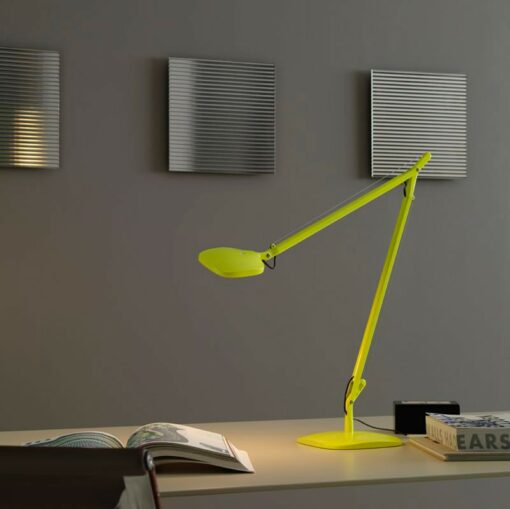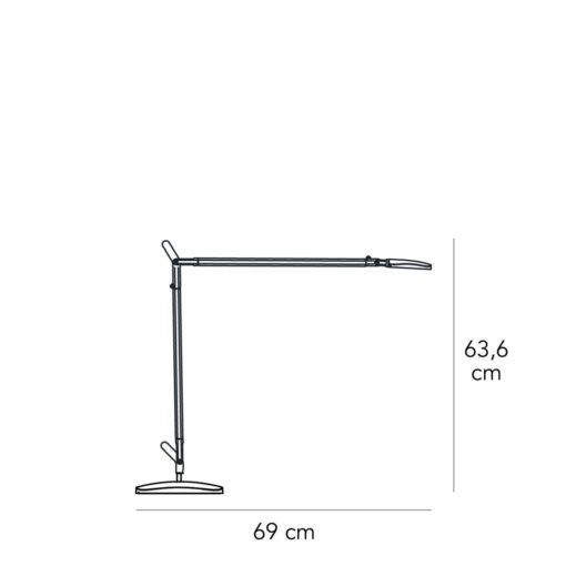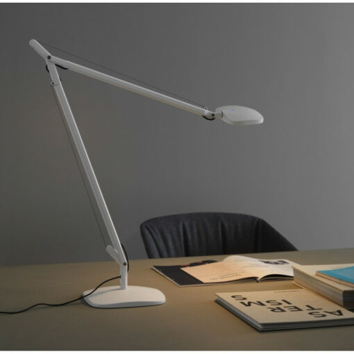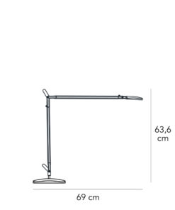 Lampada da tavolo a luce diretta con accensione e regolazione flusso luminoso tramite sensore touch posto sulla testa. Inoltre è possibile accendere e spegnere la lampada passando la mano sotto la testa dell’apparecchio. Montatura composta da una testa e aste strutturali in alluminio verniciato, cavo di alimentazione e spina neri. Alimentatore