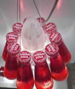 Materiali:Dieci bottiglie Campari Soda originali, staccabili singolarmente, materiale sintetico. Cavo trasparente.