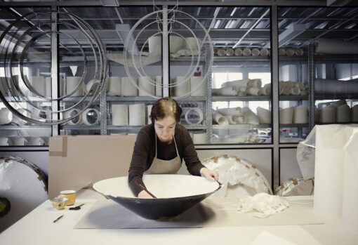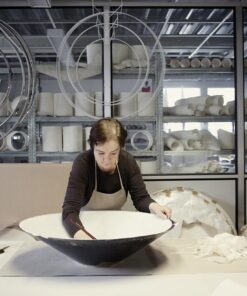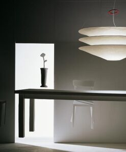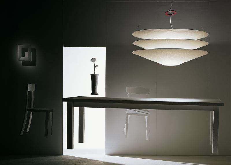 Carta giapponese, metallo. Anello rosso in ferro per la regolazione dell’altezza, rosone in metallo verniciato bianco.