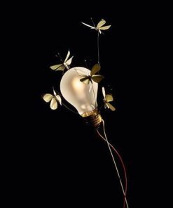 Cinque farfalle cavolaie che danzano intorno a una lampadina,I modelli di farfalla sono realizzati a mano e fissati con sottili fili intorno alla lampadina.