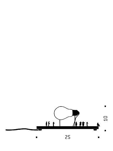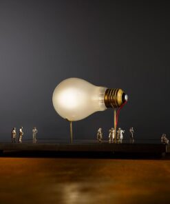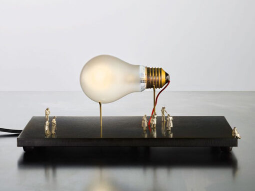 Otto piccole figure raggruppate intorno a una lampadina. La lampadina opaca, che ricorda un monumento al centro di una piazza, è appoggiata su due sottili aste in ottone.