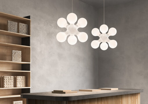 Lampada a sospensione, un oggetto luminoso dal design organico e sinuoso, una perffetta sinergia tra arte e scienza. Versione immaginifica dell’atomo, per una lampada a sospensione che diventa ancora più suggestiva in sequenze ripetute perfette per grandi spazi.