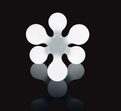 Lampada da tavolo o da terra con diffusore in polietilene stampato in rotazionale e struttura interna a sei luci montate su molle tensionate in acciaio.