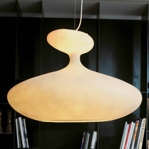 Lampada a sospensione, dalla spiccata valenza decorativa e dall’originale forza estetica, un oggetto dove la materia si trasforma e diventa un corpo luminoso. Forme fluide e irregolari creano un nuovo suggestivo equilibrio, ideale per gli spazi collettivi e per le scenografie contract.