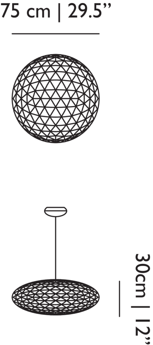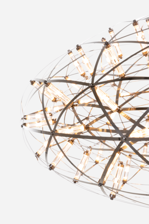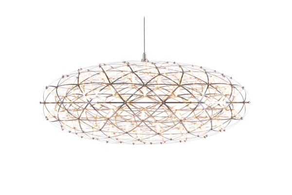 Il Raimond Zafu crea un effetto extraterrestre con la sua forma ellittica e le minuscole luci a LED. Come i suoi membri sferici della famiglia, il Raimond Zafu è realizzato con le stesse eleganti strisce di metallo e gli stessi ingredienti matematici. Il nome Zafu deriva dalla forma trascendentale ispirata al cuscino da meditazione del designer Raimond Puts.