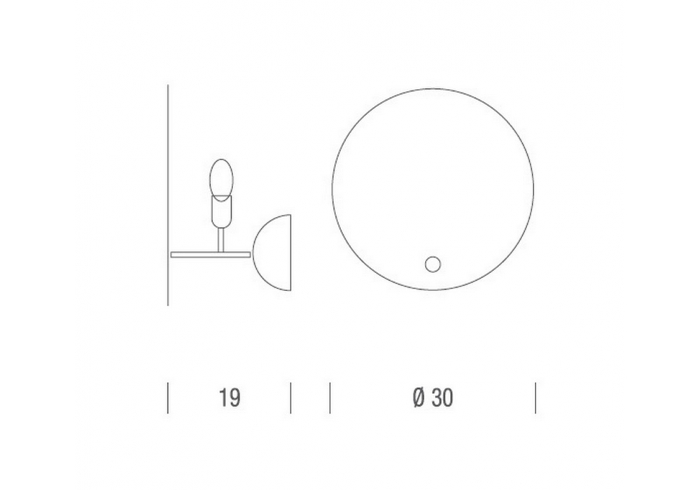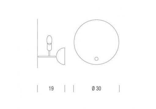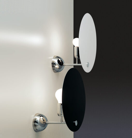 Lampada da parete costituita da un riflettore circolare in alluminio che scherma l’emissione luminosa, creando l’effetto di un’eclissi solare. Lo schermo circolare è verniciato bianco e nero, lo stelo e le minuterie metalliche sono cromati, così come il supporto semisferico a parete.