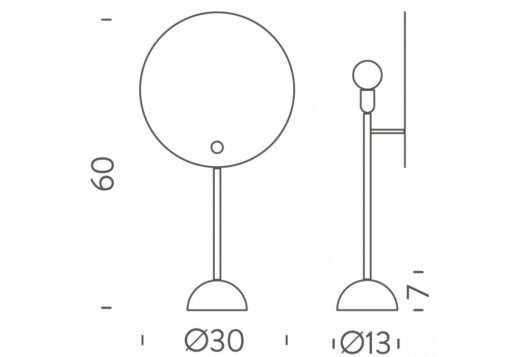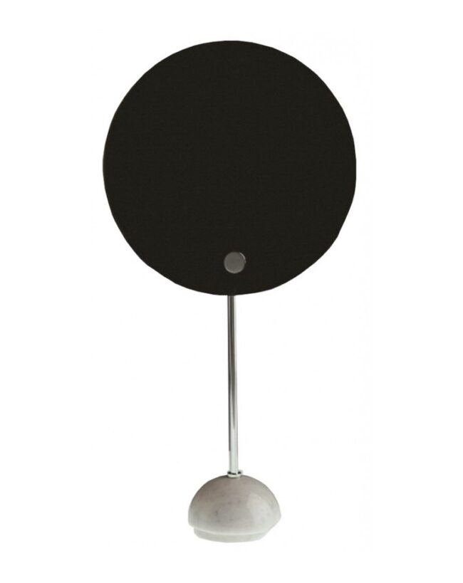 Lo schermo circolare è verniciato in bianco e nero, lo stelo e le minuterie metalliche e il supporto semisferico sono cromati. Versione da tavolo con base in marmo bianco.