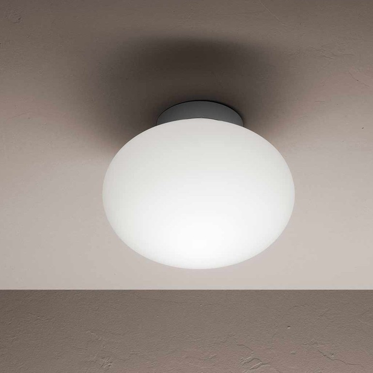 Il diffusore in vetro opalino offre una luce morbida e diffusa distribuita sul ripiano e sulle pareti. La base, realizzata in alluminio, è verniciata di colore grigio cromato. Il corpo sferico le conferisce uno stile semplice ed elegante, rendendola adatta a qualsiasi spazio di arredo.