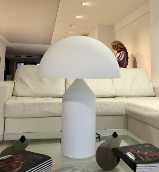 Atollo famosa lampada da tavolo del brand Oluce, in vetro soffiato opale bianco altezza 70 cm
