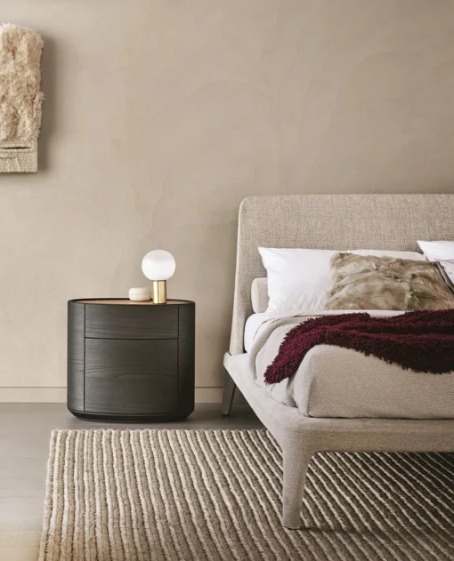 Comodino con 2 cassetti dalla linea sinuosa e delicata dalla forma di un perfetto ovale in appoggio a terra. Kelly è caratterizzato da una lavorazione impeccabie e finiture di pregio come l’essenza olmo nero per struttura e frontali e top in cuoio per ambientare al meglio camere da letto moderne, dove l’eleganza è infusa anche nel più piccolo dettaglio. Designer: Emmanuel Gallina, 2019