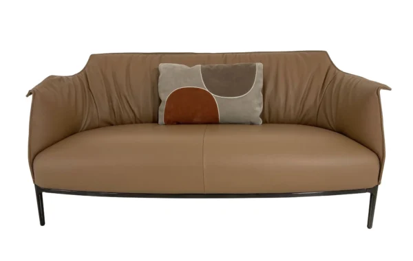 Divano 2 posti con rivestimento in Pelle Frau® e cuciture a contrasto. La struttura portante è in acciaio, mentre l’imbottitura è in poliuretano espanso, su cui è applicata ovatta poliestere nelle zone dove occorre offrire maggiore comfort. Il basamento si compone di quattro piedi in fusione di alluminio e telaio in tubolare di acciaio con varie finiture disponibili. Il molleggio è ottenuto con cinghie elastiche.