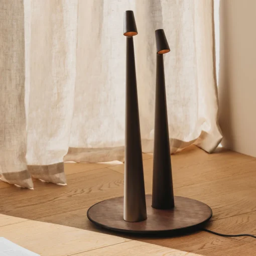 Accessorio base magnetica in noce per lampada da tavolo dal sottile stelo conico che sfocia in un’elegante testina. La lampada portatile Africa, disponibile in due dimensioni, presenta una consistenza laccata matte e quattro tonalità naturali che conferiscono calore e concretezza al design, può inoltre essere ricaricata in modo unico o in gruppo tramite un vassoio di carica magnetica.
