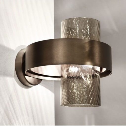 Lampada a parete della storica vetreria Vistosi, una collezione dai connotati contemporanei che racchiude preziosi contenuti storici della lavorazione del vetro quali il “balloton” e il rigadin dritto e ritorto.